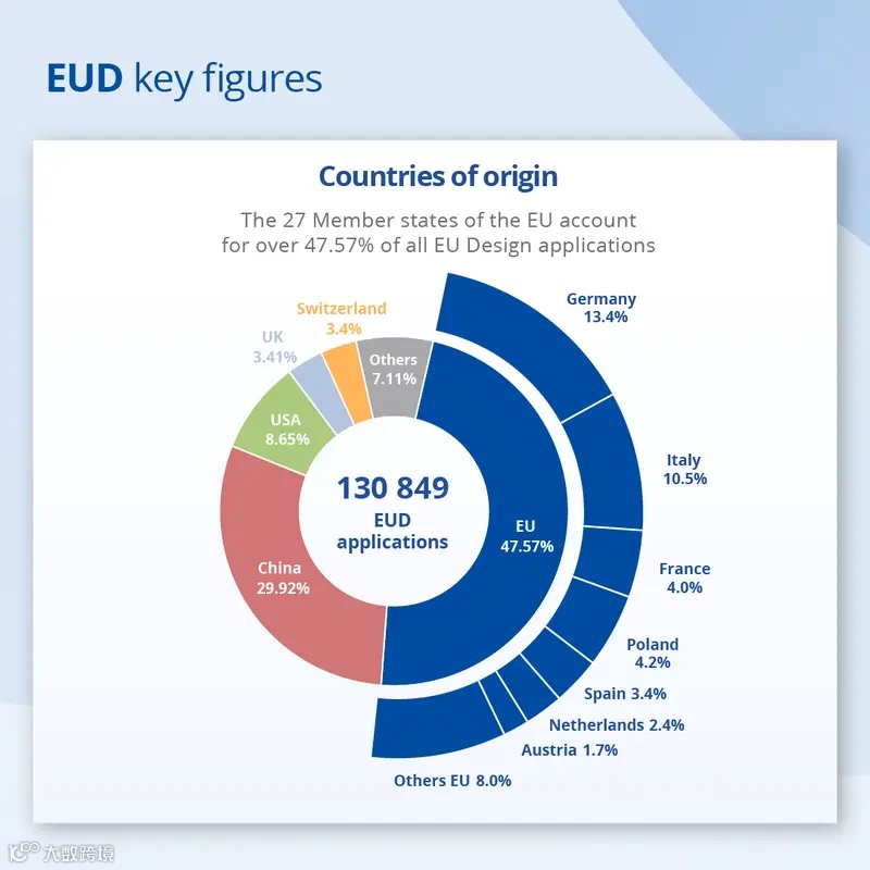 在歐盟內(nèi)部,設(shè)計申請主要來自德國(13.4%),其次是意大利(10.5%)、波蘭(4.2%)、法國(4%)和西班牙(3.4%)。