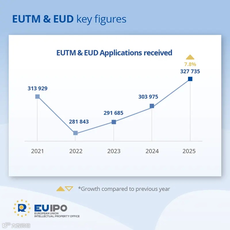 在2025年,歐盟知識產(chǎn)權(quán)局(EUIPO)收到327,735份新的歐盟商標(biāo)和歐盟設(shè)計申請。這是自1996年該局開始接受申請以來,知識產(chǎn)權(quán)(IP)申請的最高年度數(shù)量??傮w而言,與2024年相比,增長了7.8%,超過了2021年創(chuàng)下的前紀(jì)錄(收到313,928份申請)。