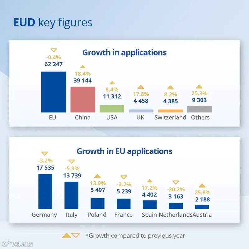 2025年,歐盟設(shè)計(EUDs)的需求也有所增加。歐盟知識產(chǎn)權(quán)局(EUIPO)收到130,849份設(shè)計申請,同比增長6%,這是連續(xù)第二年創(chuàng)下歷史新高。