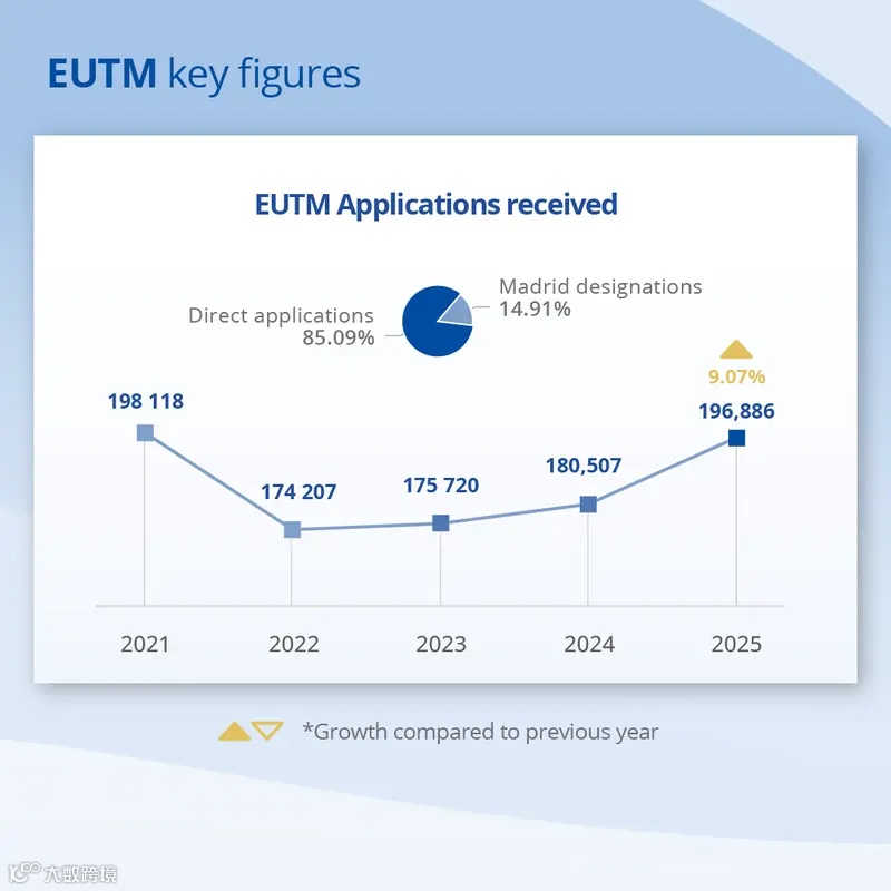 2025年,歐盟商標(biāo)(EUTMs)占據(jù)了申請總量的最大份額。歐盟知識產(chǎn)權(quán)局(EUIPO)收到196,886份歐盟商標(biāo)申請,比2024年增長了9.1%。