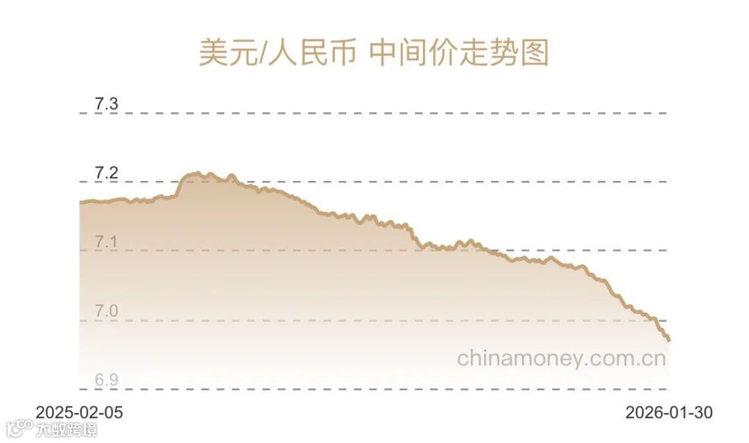 1月30日,中國外匯交易中心公布人民幣兌美元中間價(jià)報(bào)6.9678,較前一日上調(diào)93個(gè)基點(diǎn),創(chuàng)近期新高,釋放短期強(qiáng)勢信號(hào),反映市場對(duì)人民幣溫和升值的預(yù)期。