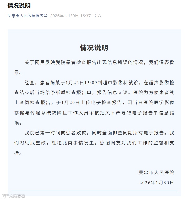 1月30日,吳忠市人民醫(yī)院發(fā)布情況說明: