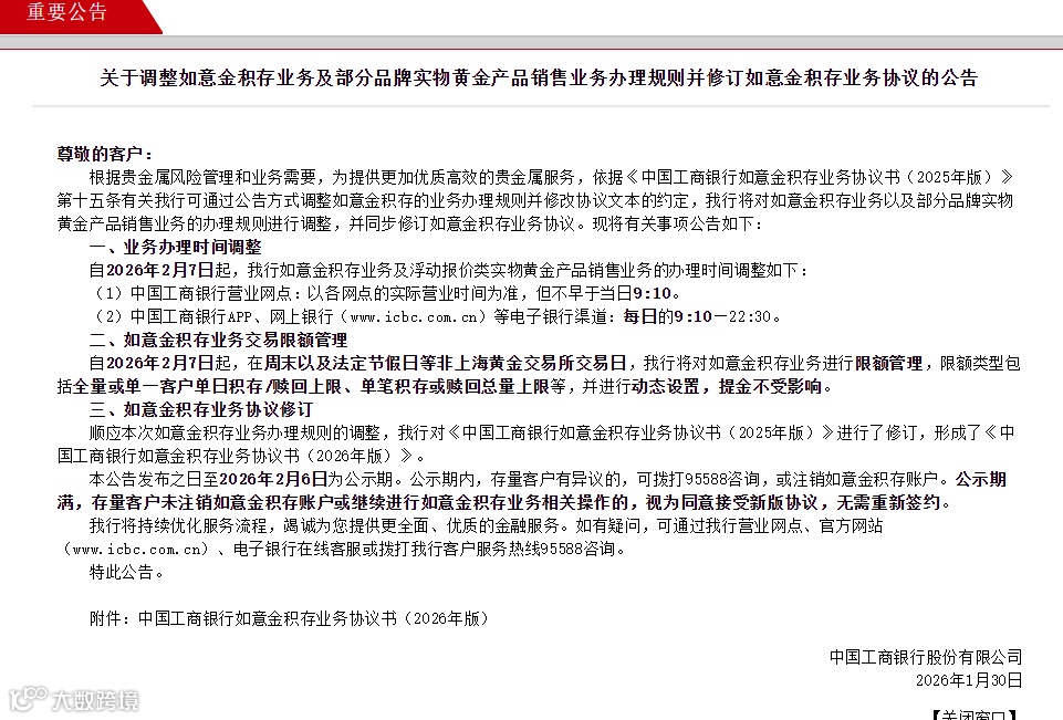 工商銀行發(fā)布關(guān)于調(diào)整如意金積存業(yè)務(wù)及部分品牌實(shí)物黃金產(chǎn)品銷售業(yè)務(wù)辦理規(guī)則并修訂如意金積存業(yè)務(wù)協(xié)議的公告。自2026年2月7日起,在周末以及法定節(jié)假日等非上海黃金交易所交易日,工商銀行將對(duì)如意金積存業(yè)務(wù)進(jìn)行限額管理,限額類型包括全量或單一客戶單日積存/贖回上限、單筆積存或贖回總量上限等,并進(jìn)行動(dòng)態(tài)設(shè)置,提金不受影響。