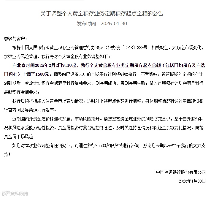 建設(shè)銀行發(fā)布關(guān)于調(diào)整個(gè)人黃金積存業(yè)務(wù)定期積存起點(diǎn)金額的公告,北京時(shí)間2026年2月2日9:10起,建設(shè)銀行個(gè)人黃金積存業(yè)務(wù)定期積存起點(diǎn)金額(包括日均積存及自選日積存)上調(diào)至1500元。調(diào)整前已設(shè)置成功的定期積存計(jì)劃將繼續(xù)執(zhí)行,不受影響。設(shè)置展期的定期積存計(jì)劃到期后,若原計(jì)劃積存金額滿足建設(shè)銀行最新要求,則展期成功,否則展期失敗。修改定期積存計(jì)劃需滿足建設(shè)銀行最新積存金額要求。后續(xù)將持續(xù)關(guān)注黃金市場(chǎng)變動(dòng)情況,適時(shí)對(duì)上述起點(diǎn)金額進(jìn)行調(diào)整。