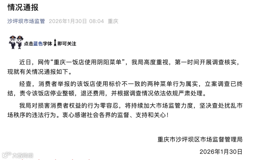1月30日,重慶市沙坪壩區(qū)市場(chǎng)監(jiān)督管理局發(fā)布情況通報(bào):近日,網(wǎng)傳“重慶一飯店使用陰陽(yáng)菜單”,我局高度重視,第一時(shí)間開(kāi)展調(diào)查核實(shí),現(xiàn)就有關(guān)情況通報(bào)如下。