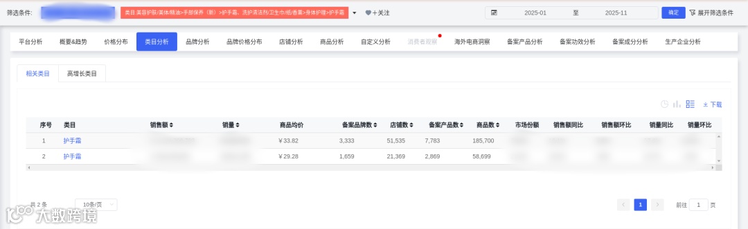 細(xì)分品類中,手部滋潤霜占比79.01%,均價(jià)33.82元;手部護(hù)理類占比20.99%,均價(jià)29.28元,銷售額同比分別增長16.13%和18.20%。