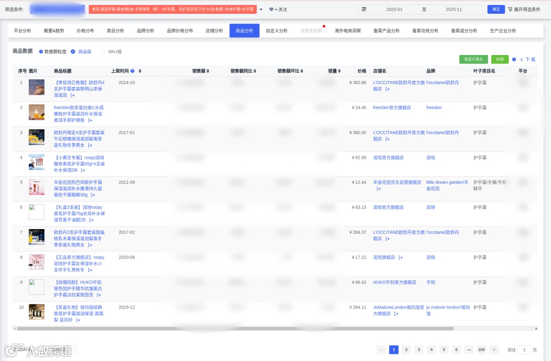 銷量高度集中于低價(jià)區(qū)間:0~44元價(jià)格帶銷量占比80.54%(約9891萬件),44~88元占比12.92%,而高價(jià)產(chǎn)品(≥88元)僅占6.54%。商品呈現(xiàn)兩極分化趨勢——半畝花田9.9元產(chǎn)品銷量達(dá)242萬件,歐舒丹560元產(chǎn)品銷量為7.7萬件,顯示平價(jià)走量、高端溢價(jià)的雙軌模式。