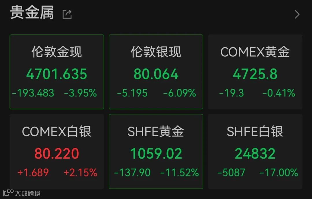 • 現(xiàn)貨黃金盤(pán)中暴跌12%至4680美元/盎司,創(chuàng)1983年以來(lái)最大單日跌幅,振幅近770美元;