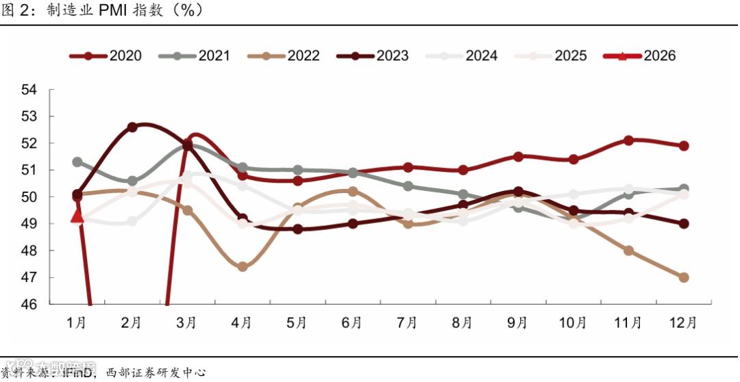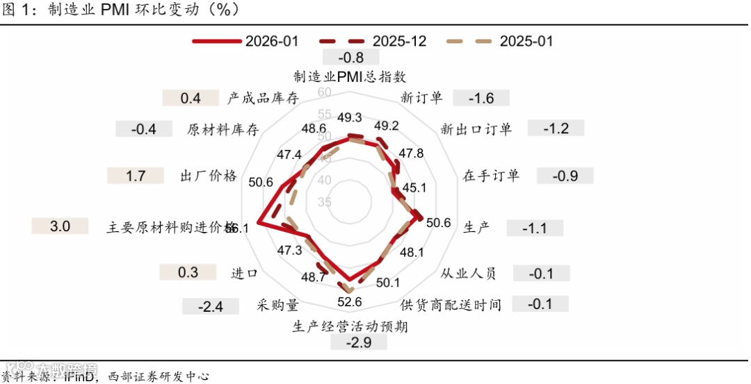 1月制造業(yè)PMI為49.3%,較上月回落0.8個(gè)百分點(diǎn),低于榮枯線(xiàn),顯示整體景氣度有所放緩。