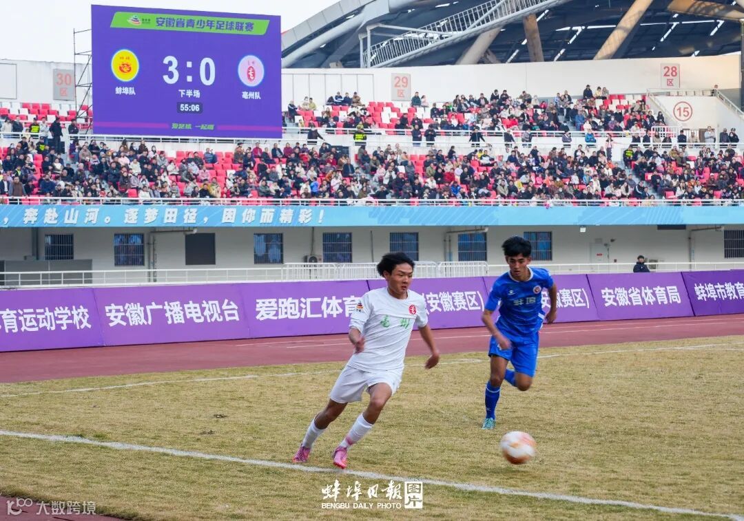 冬日暖陽灑滿蚌埠體育中心體育場(chǎng),看臺(tái)上彩旗招展、人聲鼎沸。12月7日14時(shí)30分,安徽省青少年足球聯(lián)賽的激烈對(duì)決在此上演——身披藍(lán)色戰(zhàn)袍的蚌埠隊(duì)坐鎮(zhèn)主場(chǎng),迎戰(zhàn)身著白色隊(duì)服的亳州隊(duì)。當(dāng)“珍珠城”的凌厲速度撞上“藥都”的堅(jiān)韌防守,一群足球少年在綠茵場(chǎng)上展開熱血拼殺,奏響了青春最強(qiáng)音。
