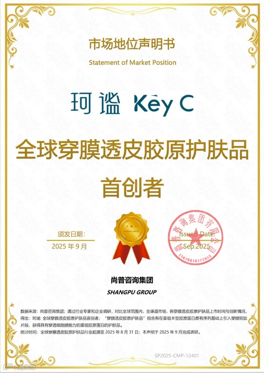 珂謐獲尚普咨詢認證“全球穿膜透皮膠原護膚品首創(chuàng)者”
