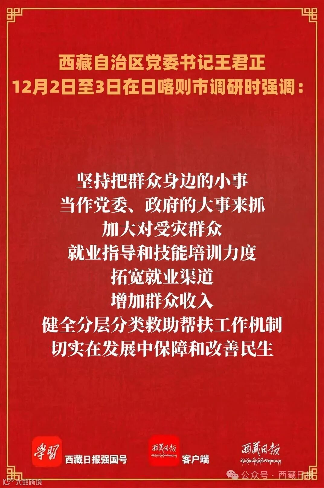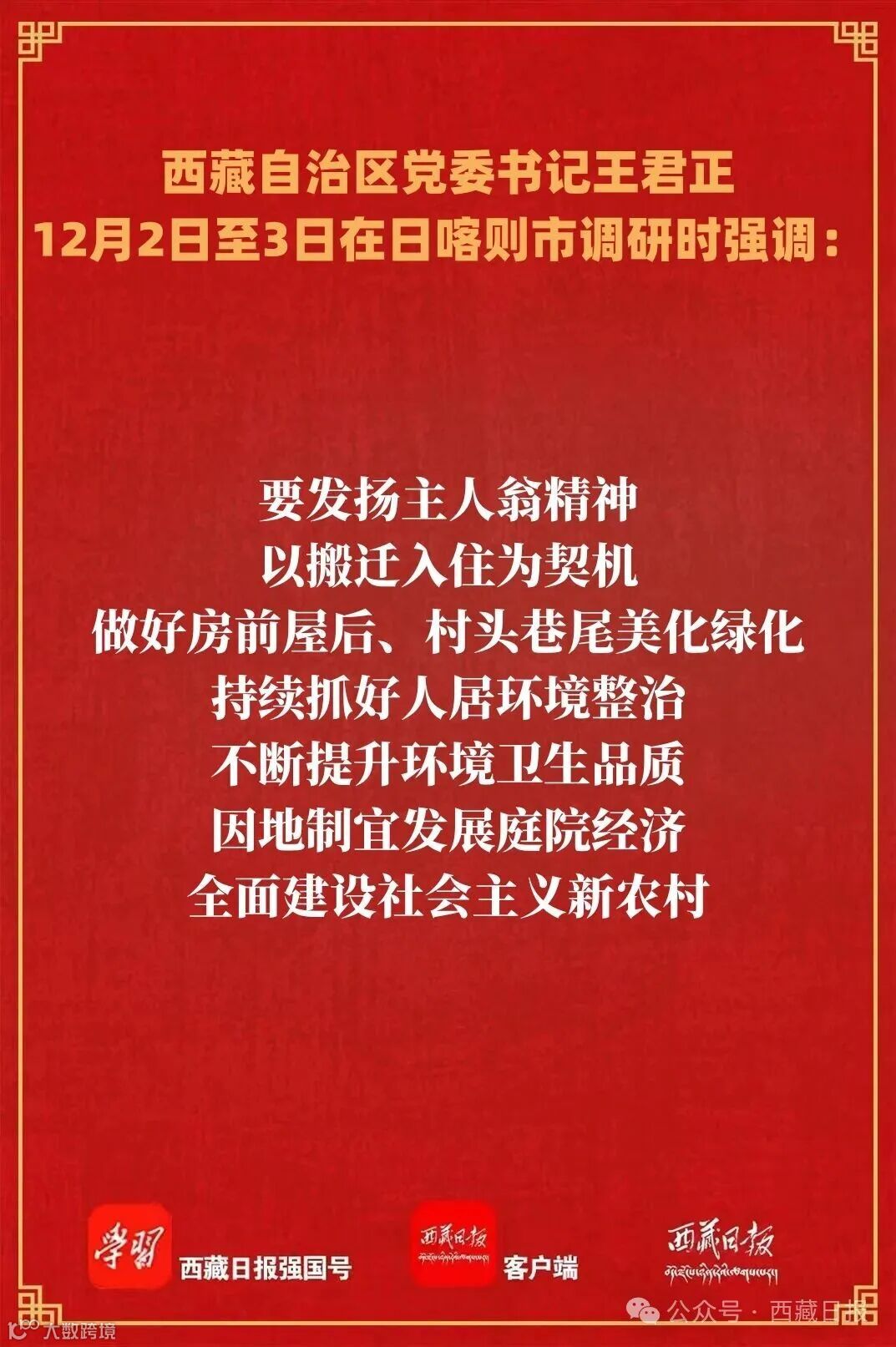 12月2日至3日,自治區(qū)黨委書記王君正在日喀則市薩迦縣、拉孜縣調(diào)研,宣講黨的二十屆四中全會精神和自治區(qū)黨委十屆九次全會精神。他強(qiáng)調(diào),要深入學(xué)習(xí)貫徹黨的二十屆四中全會精神和自治區(qū)黨委十屆九次全會精神,全面貫徹落實習(xí)近平總書記關(guān)于西藏工作的重要指示和新時代黨的治藏方略,扎實推進(jìn)鄉(xiāng)村全面振興,持續(xù)鞏固災(zāi)后恢復(fù)重建成果,全面建設(shè)社會主義新農(nóng)村,不斷增強(qiáng)各族群眾的獲得感幸福感安全感。