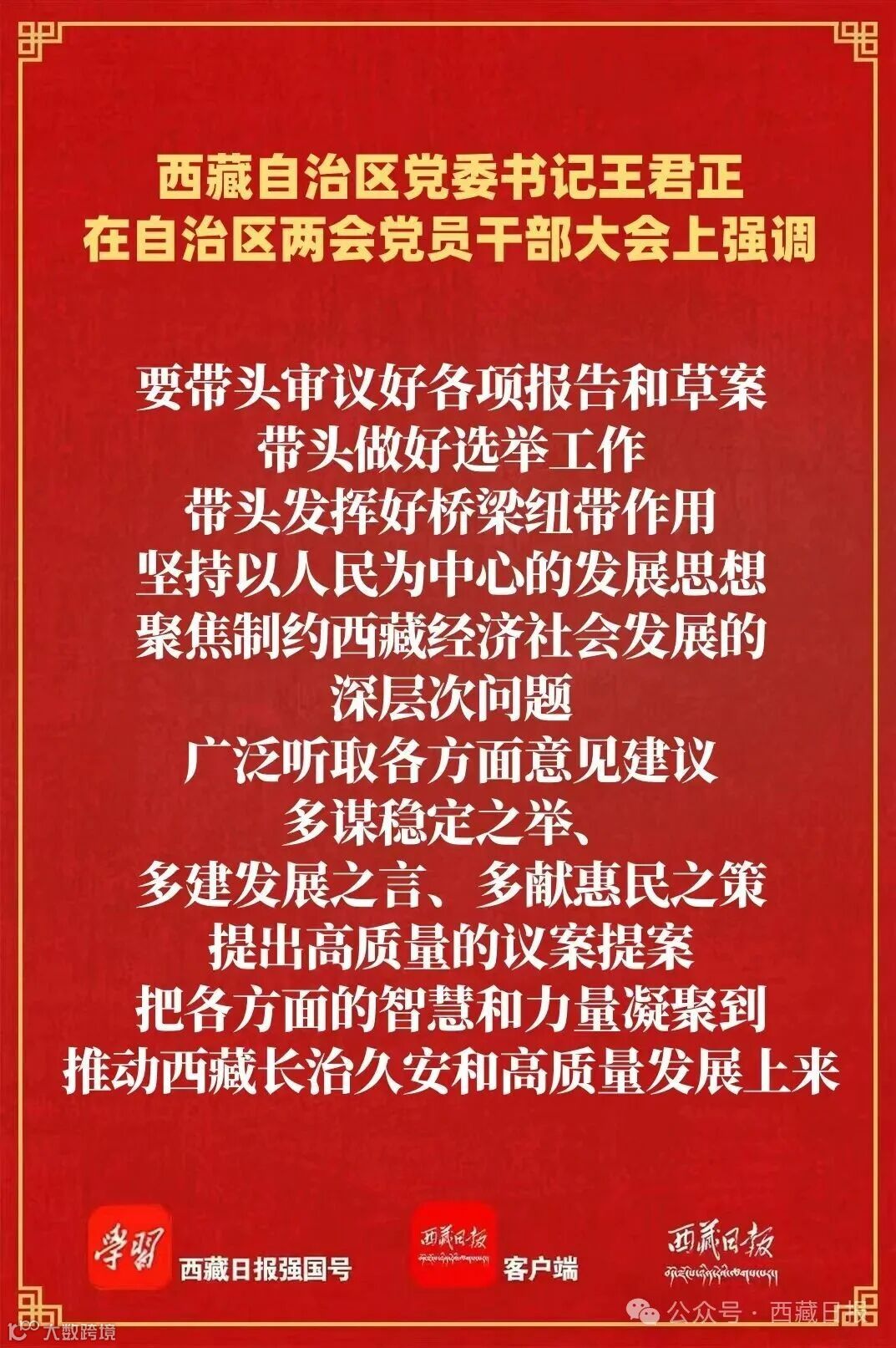 王君正強調,2026年是“十五五”開局之年,也是推進中國式現(xiàn)代化西藏實踐的關鍵一年,開好今年自治區(qū)兩會意義重大、責任重大。黨員代表、委員要提高政治站位,深刻領悟“兩個確立”的決定性意義,堅定堅決做到“兩個維護”,始終在思想上政治上行動上同以習近平同志為核心的黨中央保持高度一致;堅持不懈用黨的創(chuàng)新理論武裝頭腦、指導實踐、推動工作,努力掌握習近平新時代中國特色社會主義思想蘊含的科學世界觀和方法論,自覺做黨的創(chuàng)新理論的堅定信仰者和忠實實踐者;用群眾聽得懂的語言和喜聞樂見的方式,把黨的路線方針政策宣傳到基層一線和群眾中去,真正讓大家聽得懂、記得住、能領會、可落實。要弘揚理論聯(lián)系實際的學風,圍繞中心、服務大局,不斷增強責任感使命感,依法履行職責、積極發(fā)揮作用,團結和帶動全體代表、委員心往一處想、勁往一處使,自覺把西藏工作置于黨和國家事業(yè)發(fā)展全局中思考研究、謀劃推動,凝聚起推進中國式現(xiàn)代化西藏實踐的強大合力。要帶頭審議好各項報告和草案,帶頭做好選舉工作,帶頭發(fā)揮好橋梁紐帶作用,堅持以人民為中心的發(fā)展思想,聚焦制約西藏經濟社會發(fā)展的深層次問題,廣泛聽取各方面意見建議,多謀穩(wěn)定之舉、多建發(fā)展之言、多獻惠民之策,提出高質量的議案提案,把各方面的智慧和力量凝聚到推動西藏長治久安和高質量發(fā)展上來。要嚴守政治紀律和政治規(guī)矩,把黨的領導貫穿履職盡責全過程各方面,嚴格請示報告制度,嚴格遵守組織紀律、選舉紀律和保密紀律,認真執(zhí)行中央八項規(guī)定及其實施細則精神和自治區(qū)黨委實施辦法,樹牢“過緊日子”思想,自覺約束自我、接受監(jiān)督,集中精力開好兩會。要堅持團結穩(wěn)定鼓勁、正面宣傳為主,多反映基層代表、委員的心聲,講好西藏故事、傳遞兩會聲音,讓全區(qū)各族人民更好地了解兩會、關注兩會、支持兩會。