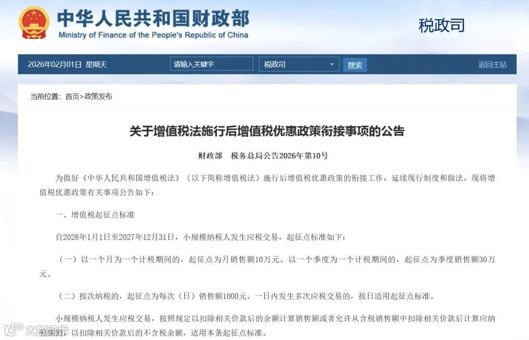 該公告進(jìn)一步調(diào)整優(yōu)化了自然人增值稅起征點(diǎn)標(biāo)準(zhǔn)判定細(xì)則,自2026年1月1日至2027年12月31日,按次納稅起征點(diǎn)標(biāo)準(zhǔn)由每次(日)銷售額500元提升到1000元,并明確自然人發(fā)生出租不動產(chǎn)、通過“反向開票”銷售報(bào)廢產(chǎn)品等6種特定情形的,不再適用按次納稅1000元的起征點(diǎn)標(biāo)準(zhǔn),而是參照按期納稅直接適用月銷售額10萬元的起征點(diǎn)標(biāo)準(zhǔn)。