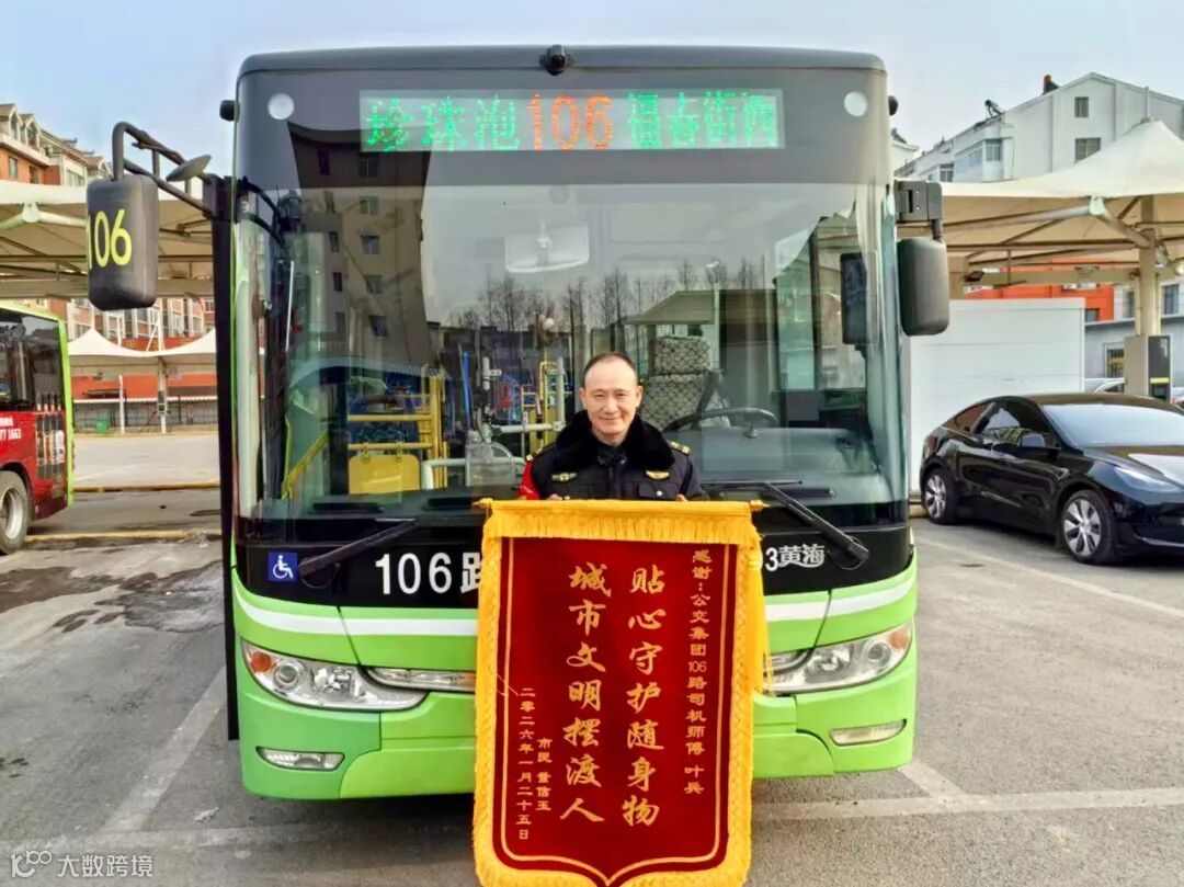 1月26日,失主懷著感激之情,將印有“貼心守護隨身物 城市文明擺渡人”的錦旗送到駕駛員葉兵手中。