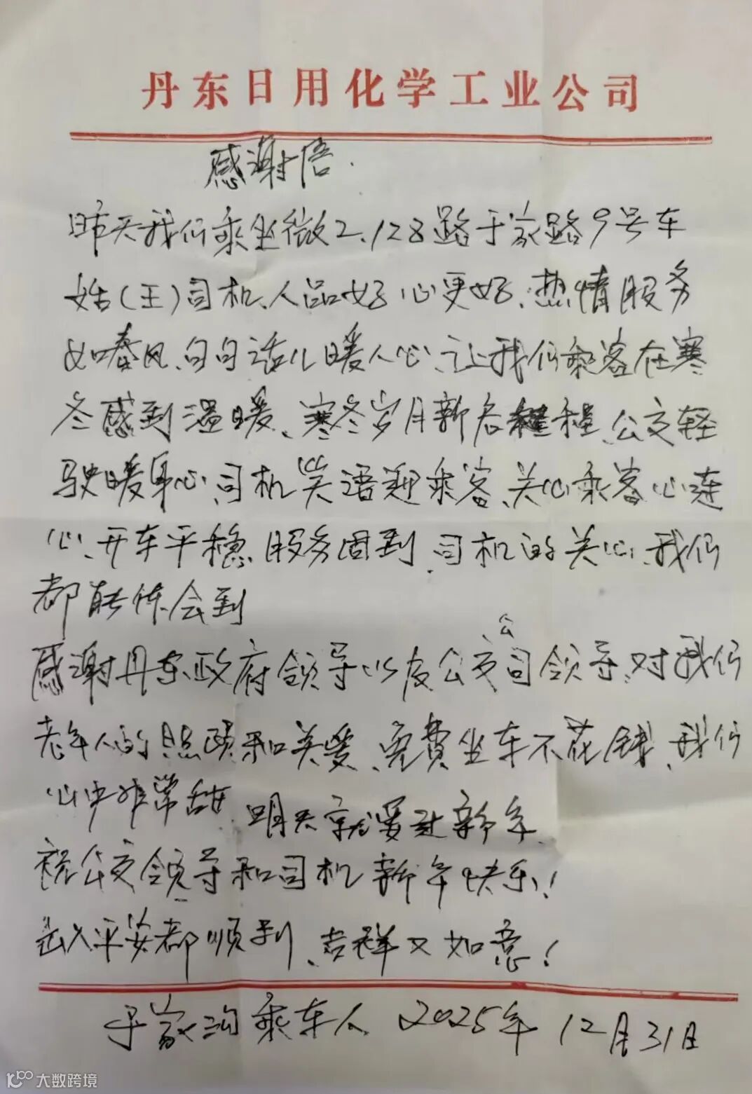 微2駕駛員王忠華,用細致入微的服務打動了乘客的心。12月31日,家住于家溝的一位乘客專程寫下感謝信,字里行間滿是感動:“王忠華人品好、心更好,笑容如春風,服務似暖陽。”信中提到,王忠華駕車平穩(wěn),遇老年乘客總主動提醒下車溫柔耐心,讓年長乘客在嚴寒中感受到如家般的溫暖。乘客還特別感謝丹東公交對老年群體的關(guān)懷,為微循環(huán)公交的便民利民舉措點贊,并送上誠摯的新年祝福。