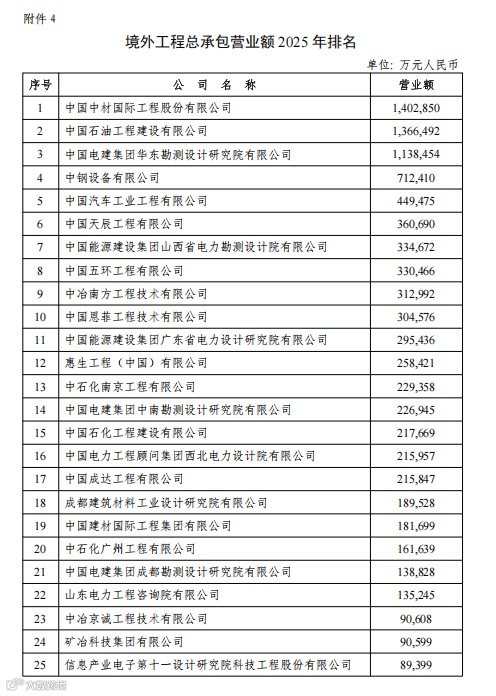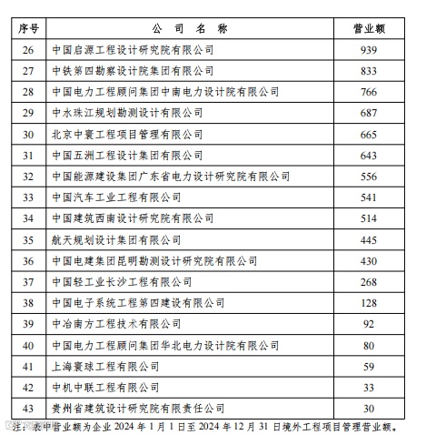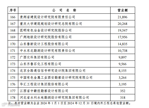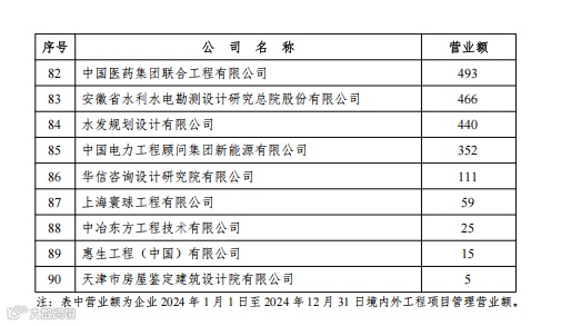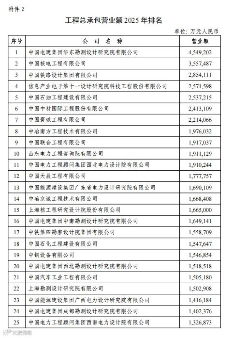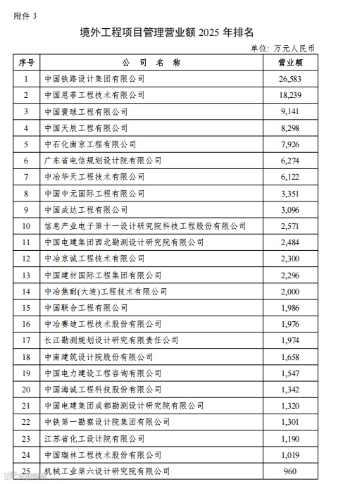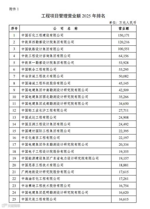 在各地方、各部門勘察設(shè)計(jì)同業(yè)協(xié)會支持與配合下,相關(guān)企業(yè)完成了工程項(xiàng)目管理、工程總承包等各項(xiàng)排序數(shù)據(jù)的自主申報工作,各地方、各部門勘察設(shè)計(jì)同業(yè)協(xié)會和總承包分會按照《勘察設(shè)計(jì)企業(yè)工程項(xiàng)目管理和工程總承包營業(yè)額排名活動管理辦法》(2018年修訂)對企業(yè)的申報數(shù)據(jù)進(jìn)行了審核、匯總和復(fù)核?,F(xiàn)批準(zhǔn)公布工程項(xiàng)目管理、工程總承包、境外工程項(xiàng)目管理、境外工程總承包營業(yè)額2025年排名(詳見附件)。