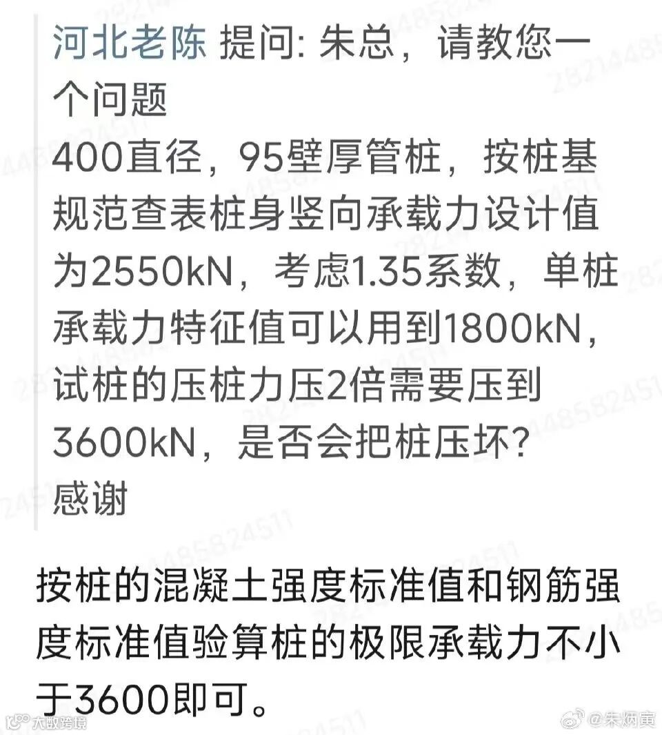大體意思就是,當樁的承載力特征值受樁身控制時,試樁時壓樁力為2倍承載力特征值,是否會把樁壓壞?按照朱總的解答:當樁身承載力計算公式中用混凝土強度和鋼筋強度標準值代入計算時,計算結果大于樁的極限承載力時,樁就不會破壞。