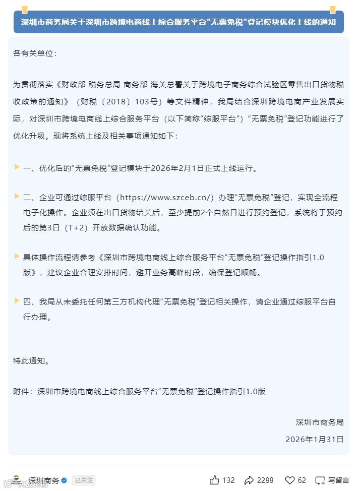 2026年1月31日,深圳商務(wù)局宣布:結(jié)合深圳跨境電商產(chǎn)業(yè)發(fā)展實(shí)際,對(duì)深圳市跨境電商線上綜合服務(wù)平臺(tái)“無(wú)票免稅”登記功能進(jìn)行了優(yōu)化升級(jí)。