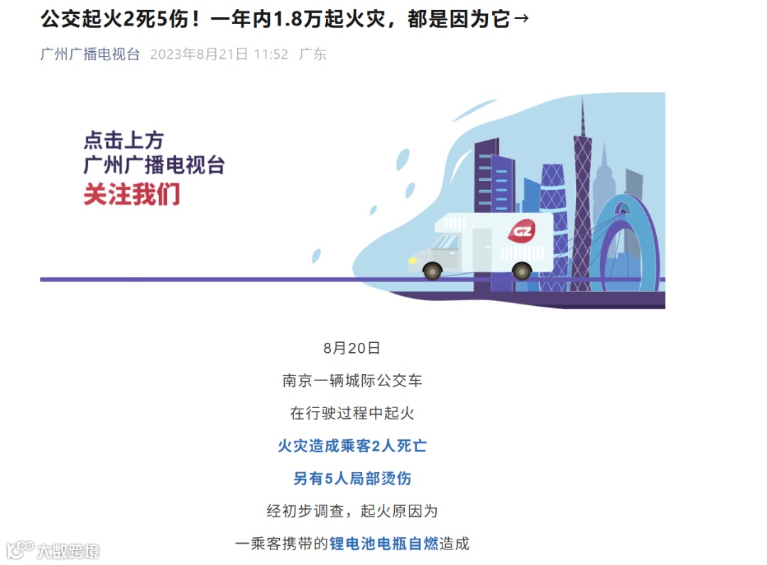 2023年,南京一輛公交車因一名乘客攜帶的鋰電池自燃導(dǎo)致車輛著火,2死5傷。如果鋰電池著火發(fā)生在高峰期的地鐵列車車廂中,后果不堪設(shè)想。