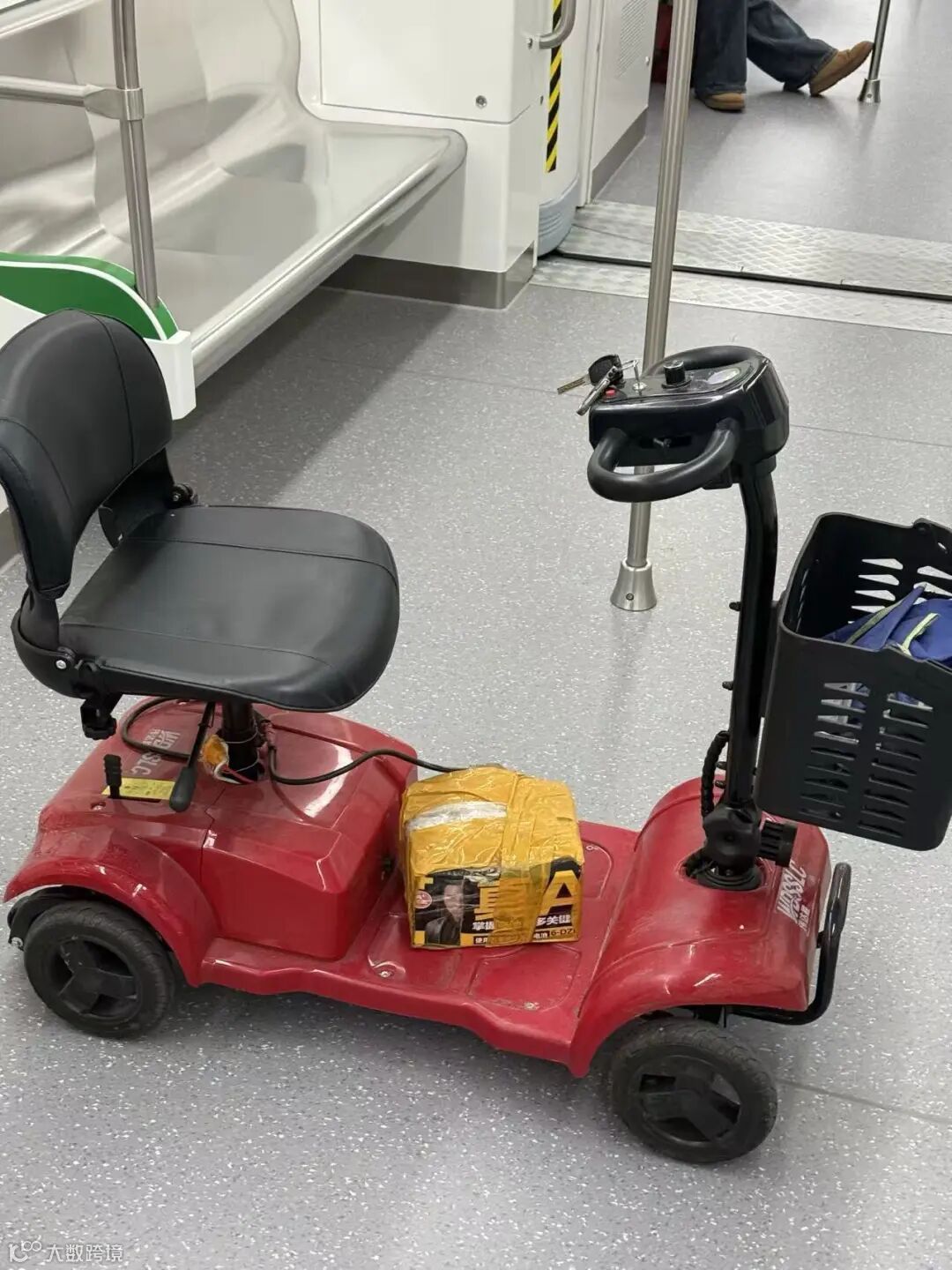該圖為6號線列車上一位殘疾人所使用的“無障礙電動車”,雖然該車在用途上歸類為“無障礙用途的助力車”,但很明顯,該車使用的動力為外接的“不合規(guī)的電池”,有極大的安全隱患,一旦發(fā)生爆燃,后果不堪設(shè)想。
