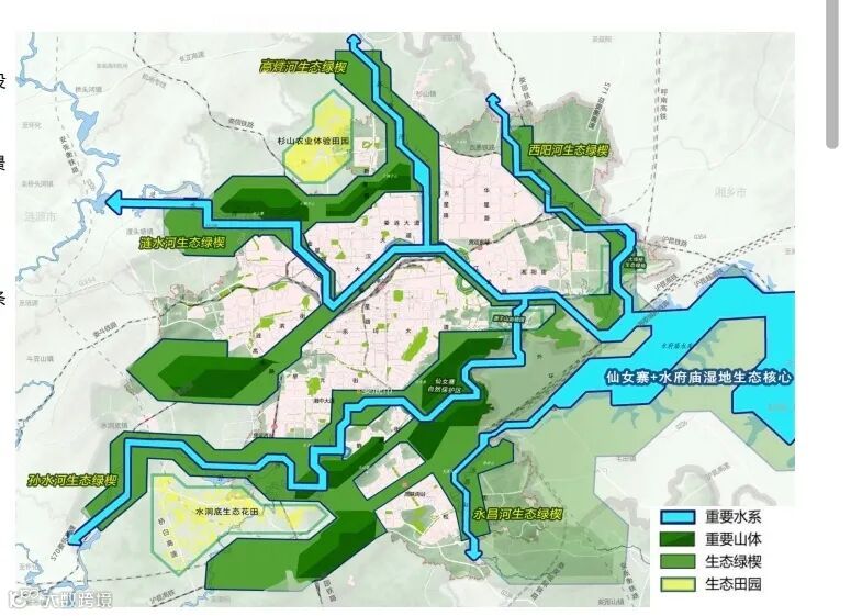 以珠山公園、石馬公園、獅子山、大樹山、仙女寨、尖山寨等自然山體構(gòu)建生態(tài)綠環(huán),以仙女寨作為城區(qū)生態(tài)綠核??刂?/span>50米以上山體為禁建區(qū),保留山體水體。漣水孫水未開發(fā)區(qū)域退讓100米以上生態(tài)緩沖帶,打造濱水活力走廊,以山水作為城市基底,塑造山水特色的組團式城市形態(tài)。修好兩河四岸風(fēng)光帶,打通兩河四岸休閑綠化帶,嚴格保留城市開發(fā)中較大水面水塘水系,尤其是城西的托塘水,水質(zhì)好,水量大,是中心城區(qū)難得的地下水源。城市更新中,注重口袋公園,轉(zhuǎn)角綠地的打造,顯山露水,突出城市山水特色,突出城市氣質(zhì)。