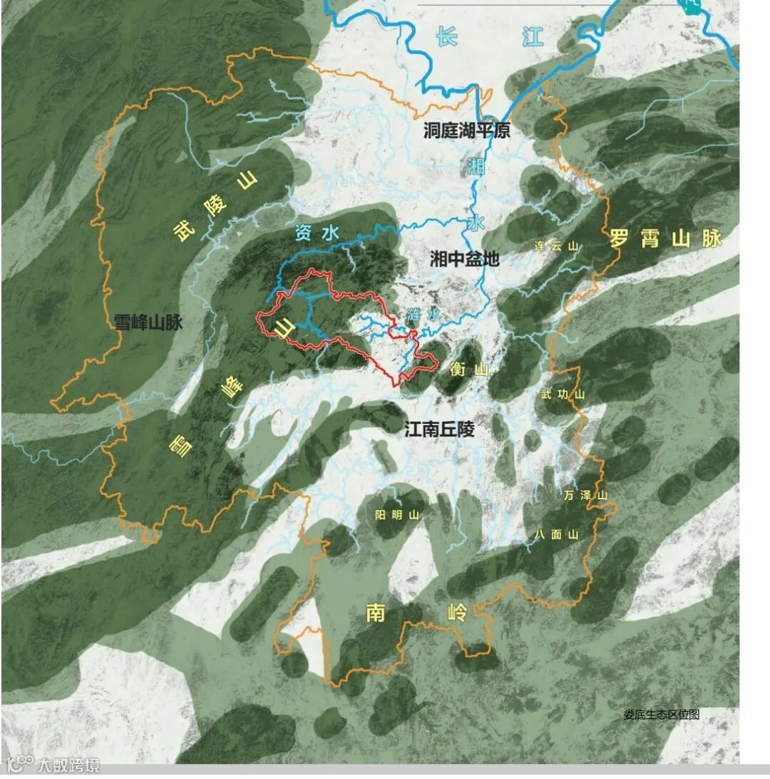 婁底中心城區(qū)大的山水格局而言,北有洪家山,南有仙女寨、尖山寨等龍山余脈。而龍山與洪家山均是雪峰山脈的支脈,其中漣源龍山具有特殊的地理意義,它是區(qū)域性分水嶺,西坡溪流匯入漣水河,東坡溪流匯入孫水河。主龍脈走向自西北(洪家山)向東南(仙女寨)延伸,形成城市“龍骨”,為城市注入“生機”,洪家山森林公園是天然屏障,山勢連綿,形成穩(wěn)固的“靠山”,象征城市發(fā)展有依托,利于穩(wěn)定性和長期規(guī)劃。洪家山森林公園是城市的“玄武”靠山,宜保持山體植被覆蓋,禁止山脊線破壞,北面大小獅子山也不宜開山挖石,破壞風(fēng)水環(huán)境。