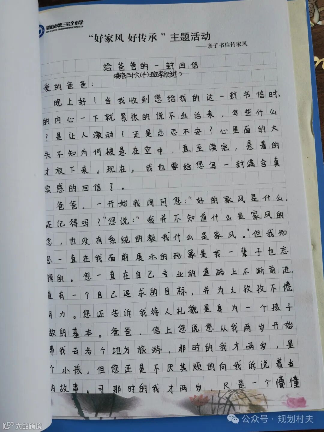 爸爸,信上您說您從我兩歲開始便帶我去各個地方旅游,那個時候的我才兩歲,是一個小孩,但您還是不厭其煩的向我訴說著當地的故事。可那時的我還只是懵懂無知的小孩呀,但如今我知道了,我知道您當時的良苦用心了,我知道您是為了讓我擁有理論和實踐結合的知識,養(yǎng)成求真務實的思維習慣。您還常常跟我說:"孩子你要知道學習在生活中處處都存在,在課堂里學的是書本知識,而課外的大自然與社會也是學習,不是嗎?你一定要養(yǎng)成自信陽光的性格?!灏职?,您看到了嗎?我現在做到了,也懂得了!