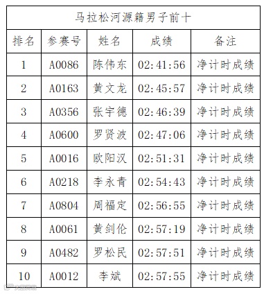馬拉松項目河源籍男子組成績公示