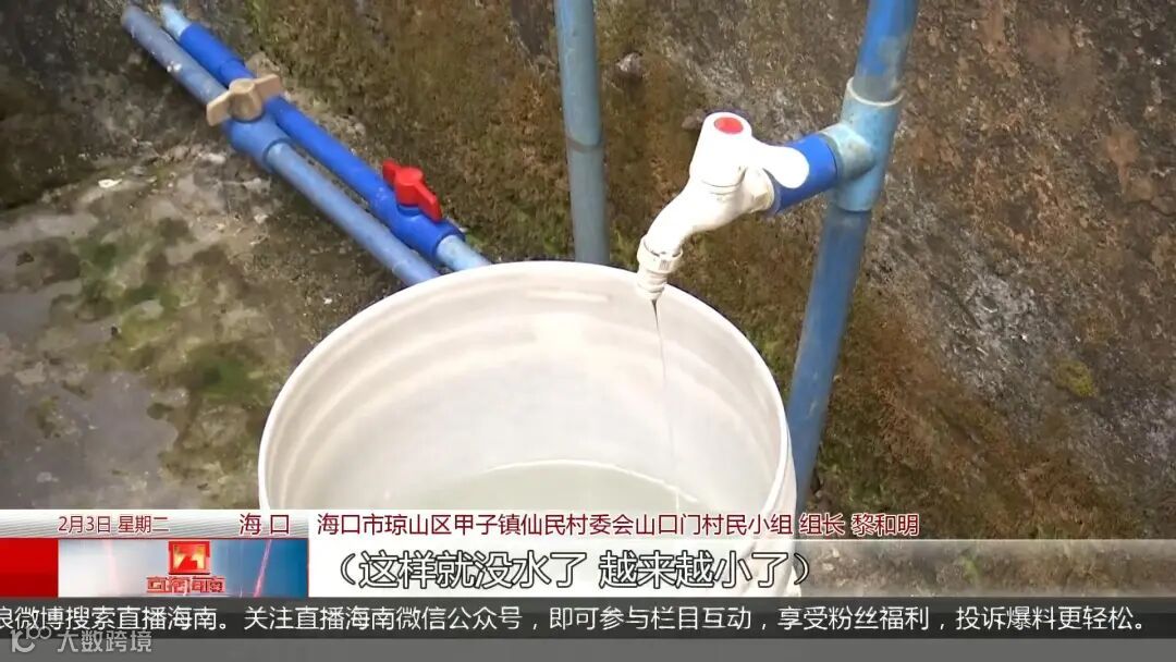 海口市瓊山區(qū)甲子鎮(zhèn)仙民村委會山口門村民小組 組長 黎和明:(這個還有點水)一點點,你看咯,馬上就沒有了,一開的時候就出來,不到一分鐘,這樣就沒有了。(這樣就沒水了)(越來越小了)就是這樣,(那一會再開還有嗎)等一下開又這樣,整體來這里接水了,(這個水你接了多久)(這里面半桶水你接了多久)昨天晚上開始接了,晚上沒人用(水)的時候開一點,接一點。