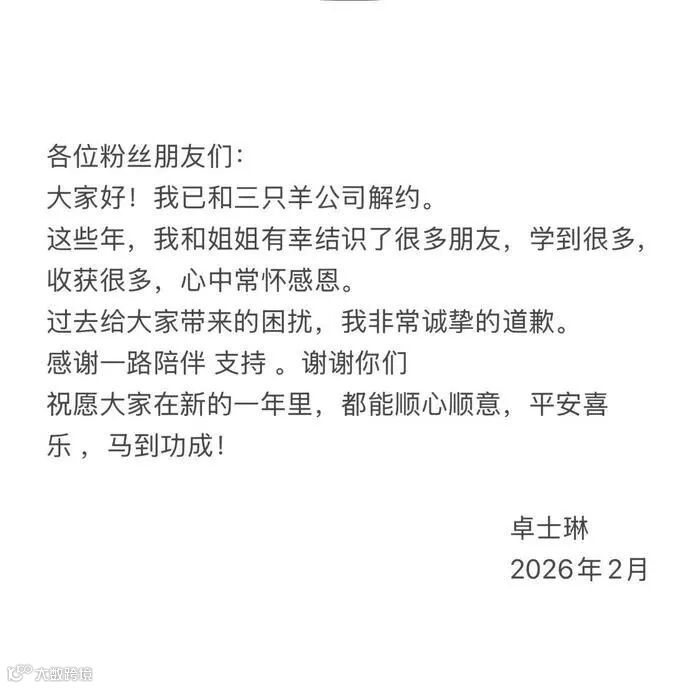 這是繼主播“紅綠燈的黃”轉(zhuǎn)戰(zhàn)海外并移除MCN標(biāo)識(shí)后,三只羊主播陣容的又一次調(diào)整。2月3日,卓士琳在抖音發(fā)布聲明稱(chēng),已與三只羊公司解除合作關(guān)系,并表示對(duì)“過(guò)去給大家?guī)?lái)的困擾”深表歉意,同時(shí)提到自己這些年與姐姐共同成長(zhǎng)、收獲頗多。七老板則表示,未來(lái)將嘗試以“更優(yōu)質(zhì)的內(nèi)容回饋觀(guān)眾”。