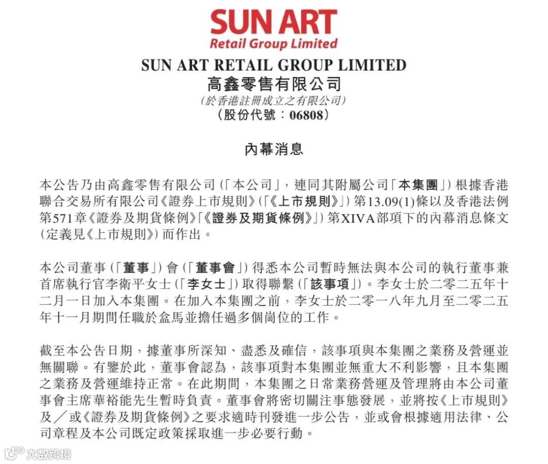 第一財(cái)經(jīng)記者梳理和采訪了解到,李衛(wèi)平的上任也是阿里系零售變革的代表舉措之一,2025年1月,阿里巴巴集團(tuán)宣布子公司及NewRetail與德弘資本達(dá)成交易,以最高約131.38億港元出售所持高鑫零售全部股權(quán),合計(jì)占高鑫零售已發(fā)行股份的78.7%。隨后,高鑫零售董事會(huì)主席由創(chuàng)始人黃明端變更為德弘資本首席執(zhí)行官華裕能。2個(gè)月前,高鑫零售CEO履新。
