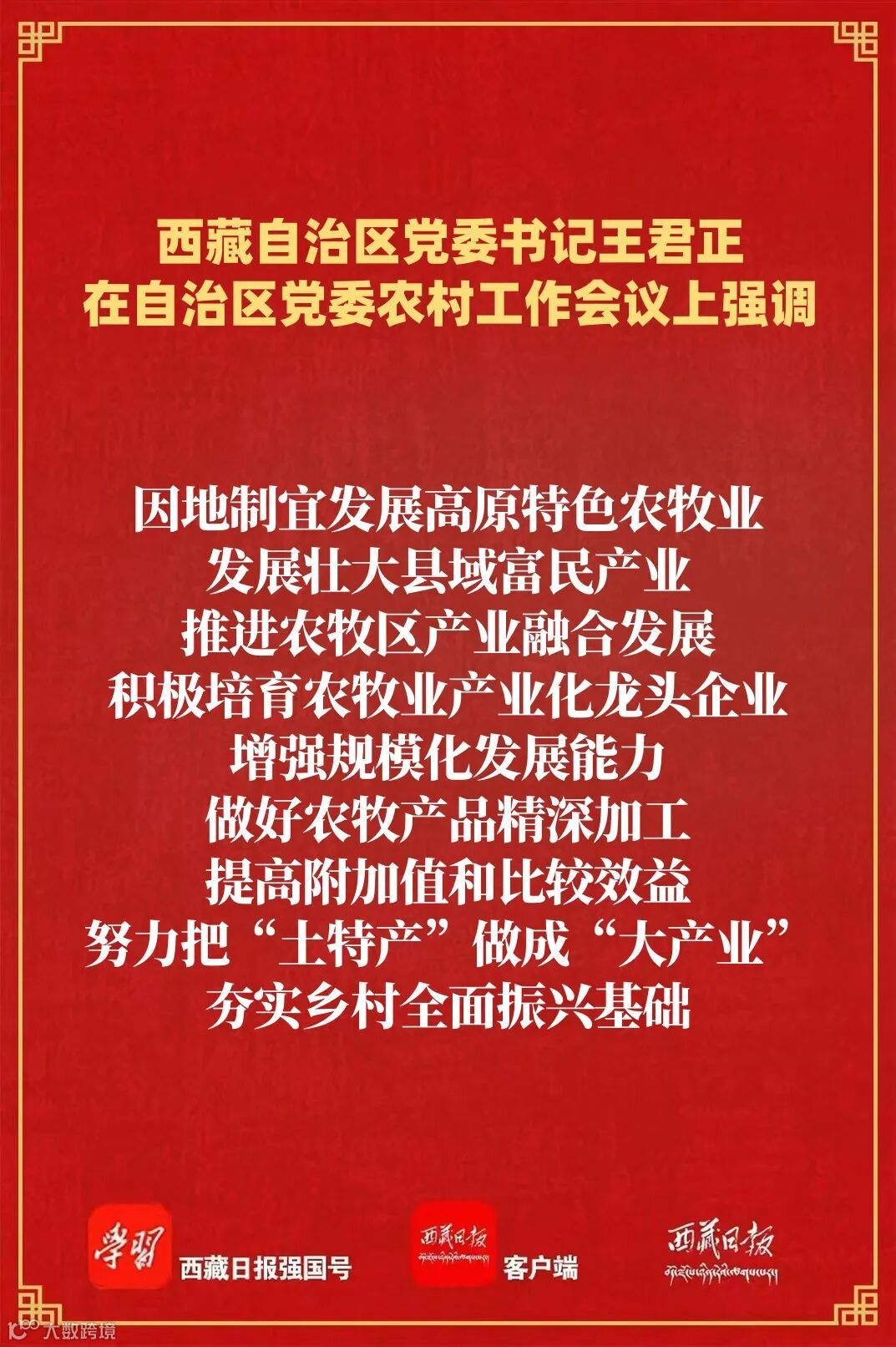 王君正強(qiáng)調(diào),要錨定目標(biāo)任務(wù),突出工作重點(diǎn),努力開(kāi)創(chuàng)我區(qū)農(nóng)業(yè)農(nóng)村現(xiàn)代化、鄉(xiāng)村全面振興新局面。高度重視“三農(nóng)”工作,深刻認(rèn)識(shí)做好“三農(nóng)”工作是全面建設(shè)社會(huì)主義現(xiàn)代化新西藏、持續(xù)抓好“四件大事”落實(shí)、鞏固黨在西藏的執(zhí)政根基的必然要求,大力支持“三農(nóng)”工作,努力實(shí)現(xiàn)全區(qū)農(nóng)業(yè)基礎(chǔ)更加穩(wěn)固、農(nóng)村地區(qū)更加繁榮、農(nóng)民生活更加紅火。多措并舉促進(jìn)農(nóng)牧民持續(xù)增收,深化農(nóng)牧區(qū)改革擴(kuò)增收,強(qiáng)化轉(zhuǎn)移就業(yè)促增收,提升強(qiáng)農(nóng)富農(nóng)政策效能穩(wěn)增收,有針對(duì)性加強(qiáng)農(nóng)牧民技能培訓(xùn),持續(xù)做好以工代賑工作,讓農(nóng)牧民深度參與產(chǎn)業(yè)鏈各環(huán)節(jié),共享全產(chǎn)業(yè)鏈增值收益,確保增收保持良好勢(shì)頭。大力實(shí)施常態(tài)化精準(zhǔn)幫扶,及時(shí)精準(zhǔn)做好監(jiān)測(cè)識(shí)別,分類做好常態(tài)化幫扶,筑牢兜底保障防線,堅(jiān)持把產(chǎn)業(yè)幫扶作為根本措施,優(yōu)化產(chǎn)業(yè)幫扶方式,不斷提升幫扶實(shí)效,確保不發(fā)生規(guī)模性返貧致貧。著力提升糧食和重要農(nóng)產(chǎn)品產(chǎn)能,毫不放松抓好糧食特別是青稞生產(chǎn),加強(qiáng)耕地保護(hù)和高標(biāo)準(zhǔn)農(nóng)田建設(shè),加強(qiáng)畜牧業(yè)和“菜籃子”產(chǎn)品生產(chǎn)供給,強(qiáng)化農(nóng)牧業(yè)科技賦能,加大氣象監(jiān)測(cè)預(yù)報(bào)預(yù)警力度,增強(qiáng)農(nóng)牧業(yè)防災(zāi)減災(zāi)能力。因地制宜發(fā)展高原特色農(nóng)牧業(yè),發(fā)展壯大縣域富民產(chǎn)業(yè),推進(jìn)農(nóng)牧區(qū)產(chǎn)業(yè)融合發(fā)展,積極培育農(nóng)牧業(yè)產(chǎn)業(yè)化龍頭企業(yè),增強(qiáng)規(guī)模化發(fā)展能力,做好農(nóng)牧產(chǎn)品精深加工,提高附加值和比較效益,努力把“土特產(chǎn)”做成“大產(chǎn)業(yè)”,夯實(shí)鄉(xiāng)村全面振興基礎(chǔ)。加快推進(jìn)高原和美鄉(xiāng)村建設(shè),深入學(xué)習(xí)運(yùn)用“千萬(wàn)工程”經(jīng)驗(yàn),加快農(nóng)牧區(qū)基礎(chǔ)設(shè)施建設(shè),提高教育、醫(yī)療、社保等公共服務(wù)水平,持續(xù)整治提升農(nóng)牧區(qū)人居環(huán)境,把農(nóng)牧區(qū)建設(shè)得更加宜居宜業(yè)。提高鄉(xiāng)村治理水平,持續(xù)加強(qiáng)黨建引領(lǐng),充分發(fā)揮基層黨組織戰(zhàn)斗堡壘作用,深化文明鄉(xiāng)風(fēng)建設(shè),推動(dòng)形成向上向善的鄉(xiāng)村道德風(fēng)尚;堅(jiān)持和發(fā)展新時(shí)代“楓橋經(jīng)驗(yàn)”,不斷提升基層治理體系和治理能力現(xiàn)代化水平,確保農(nóng)牧區(qū)持續(xù)和諧穩(wěn)定。