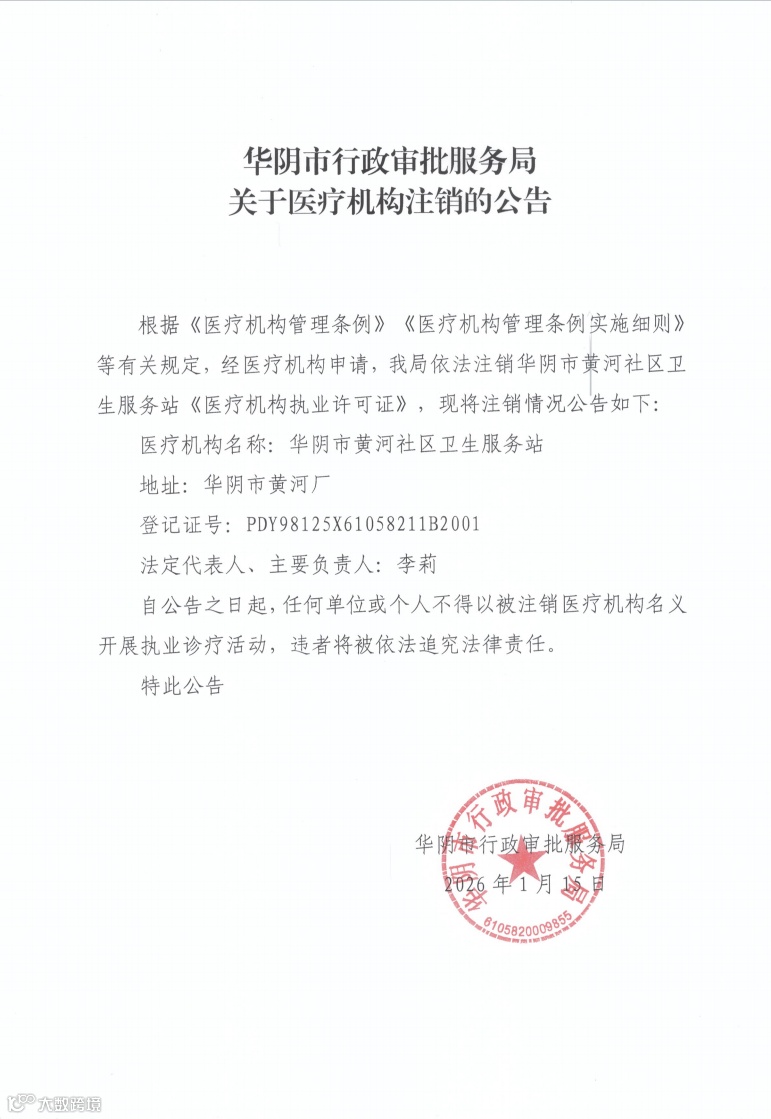 根據(jù)《醫(yī)療機(jī)構(gòu)管理?xiàng)l例》《醫(yī)療機(jī)構(gòu)管理?xiàng)l例實(shí)施細(xì)則》等有關(guān)規(guī)定,經(jīng)醫(yī)療機(jī)構(gòu)申請(qǐng),我局依法注銷華陰市黃河社區(qū)衛(wèi)生服務(wù)站《醫(yī)療機(jī)構(gòu)執(zhí)業(yè)許可證》,現(xiàn)將注銷情況公告如下: