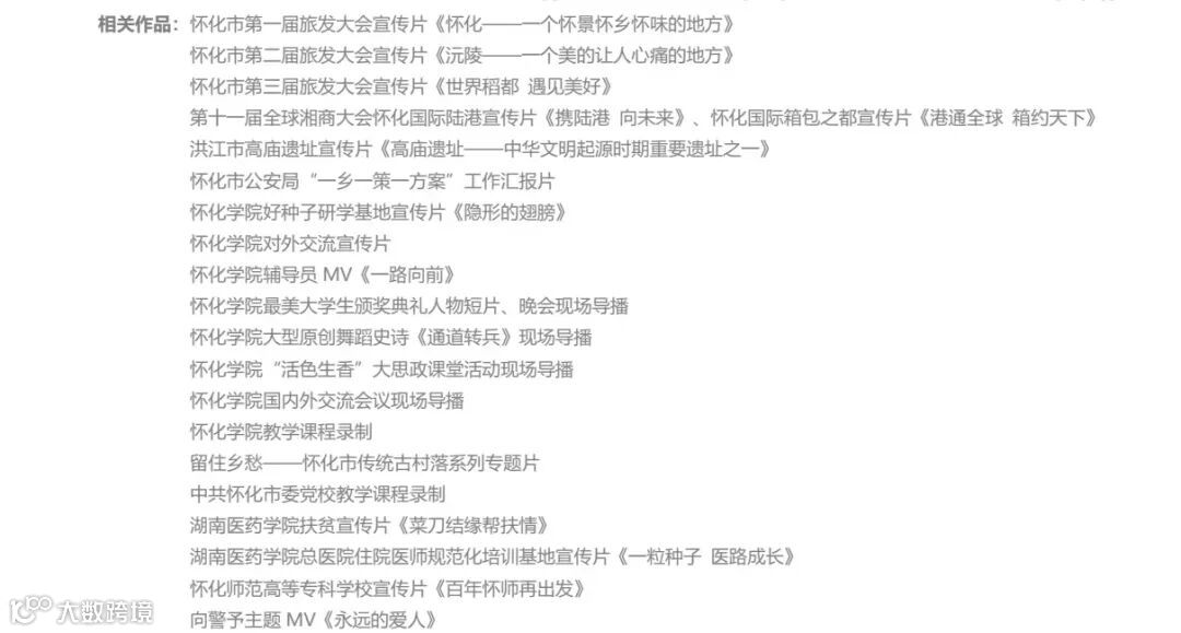 他參與拍攝剪輯了懷化市第一屆旅發(fā)大會宣傳片《懷化一個(gè)懷景懷鄉(xiāng)懷味的地方》、第十一屆全球湘商大會懷化國際陸港宣傳片《攜陸港向未來》、懷化市公安局‘一鄉(xiāng)一策一方案’工作匯報(bào)片以及洪江市高廟遺址宣傳片等。