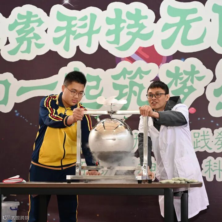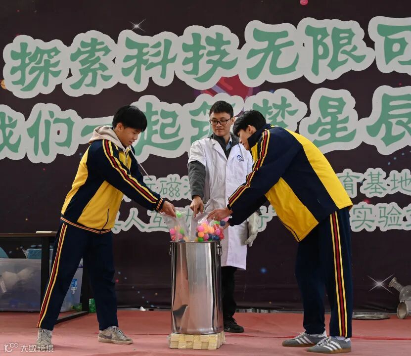 原本平凡的籃球場搖身一變,成了充滿奇幻色彩的“魔法學(xué)院”,一場精彩的科學(xué)實(shí)驗(yàn)秀即將上演。率先登場的是刺激的液氮爆炸實(shí)驗(yàn)。實(shí)驗(yàn)老師將液氮緩緩倒入可樂瓶,擰緊蓋子后放進(jìn)大桶,2位同學(xué)把彩色乒乓球倒入桶中。老師端起熱水倒入桶內(nèi)并大聲讀秒,隨著“砰”的一聲巨響,可樂瓶瞬間膨脹爆炸,強(qiáng)大的沖擊力讓彩色乒乓球如煙花般騰空而起,在空中肆意旋轉(zhuǎn)、飛散,形成絢麗畫面,現(xiàn)場驚嘆與歡呼聲此起彼伏。緊接著的乒乓球氣流實(shí)驗(yàn)和人體充電等實(shí)驗(yàn),不僅讓同學(xué)們在歡笑中領(lǐng)略到了科學(xué)的魅力,更讓同學(xué)們深刻地理解了物理知識在實(shí)際生活中的應(yīng)用。
