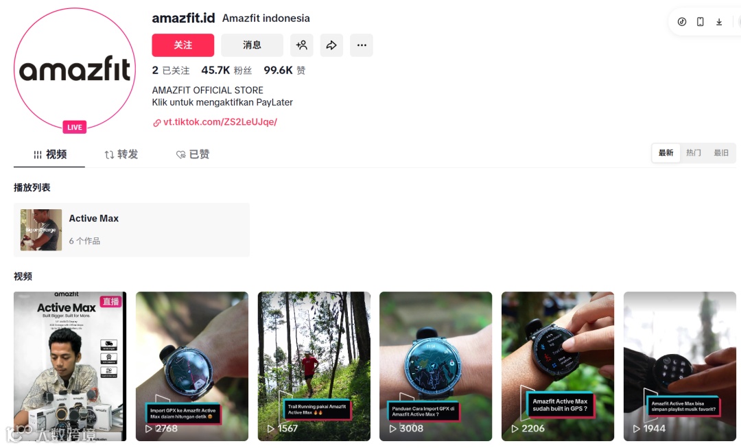 TikTok,Amazfit精準(zhǔn)發(fā)力,搭建起覆蓋印尼、泰國等核心市場(chǎng)的本地化賬號(hào)矩陣。