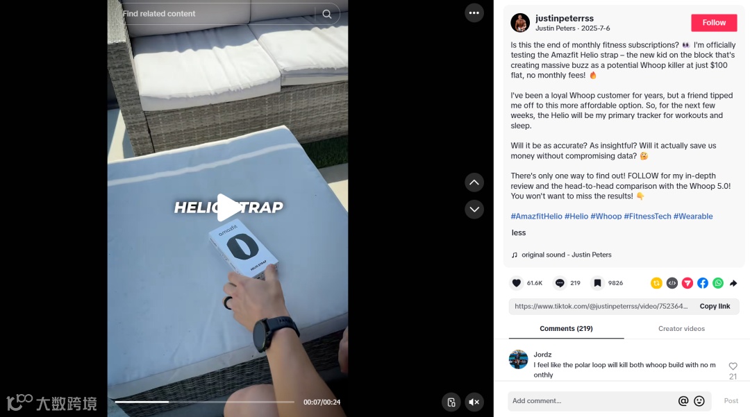 另一方面,重視粉絲僅7k的尾部健身達(dá)人@justinpeterrss,其一條Helio腕帶的真實(shí)試用測(cè)評(píng),意外斬獲210萬次觀看、6.13萬點(diǎn)贊,評(píng)論區(qū)滿是用戶咨詢與認(rèn)可,用真實(shí)體驗(yàn)實(shí)現(xiàn)“以小博大”的線上轉(zhuǎn)化奇效,助力電商渠道引流。