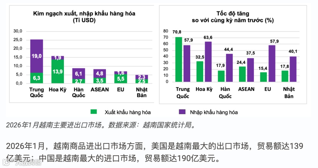 根據(jù)最新數(shù)據(jù),2026年1月越南對美出口達139億美元,同比增長近30%,貿(mào)易順差高達120億美元,接近歷史峰值。盡管美國自2025年起對越南商品加征20%關(guān)稅并威脅進一步施壓,但出口規(guī)模仍逆勢擴張,反映出美國市場對越南制造的高度依賴。
