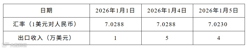 背景:B公司選擇以銷售額發(fā)生當(dāng)日匯率折算。2026年1月分別于1月1日、1月4日、1月5日實現(xiàn)出口銷售額1萬、5萬、4萬美元。
