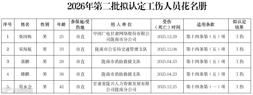 公示期為5個(gè)工作日(2026年2月5日—2026年2月12日)。公示期間,如對(duì)公示內(nèi)容有異議,請(qǐng)以真實(shí)姓名通過電話、來信、面談等形式向我局反映。我們將按照有關(guān)規(guī)定認(rèn)真受理,并進(jìn)行調(diào)查核實(shí)。公示期滿后,將按有關(guān)規(guī)定辦理工傷認(rèn)定手續(xù)。