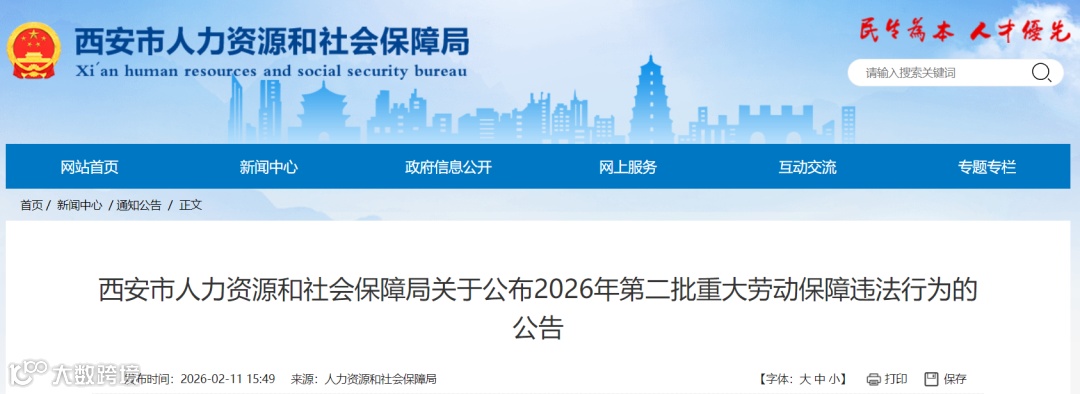 依據(jù)人力資源和社會保障部《重大勞動保障違法行為社會公布辦法》(人社部令第29號),現(xiàn)將西安市2026年第二批重大勞動保障違法行為予以公布。