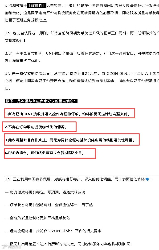 2月11日,UNI官方發(fā)布公告稱暫停OZON相關(guān)運營服務,并強調(diào)該調(diào)整為臨時性舉措。此舉顯示其仍有意維系俄區(qū)市場,但公告內(nèi)容未明確回應賣家關(guān)切,被業(yè)內(nèi)視為誠意不足。