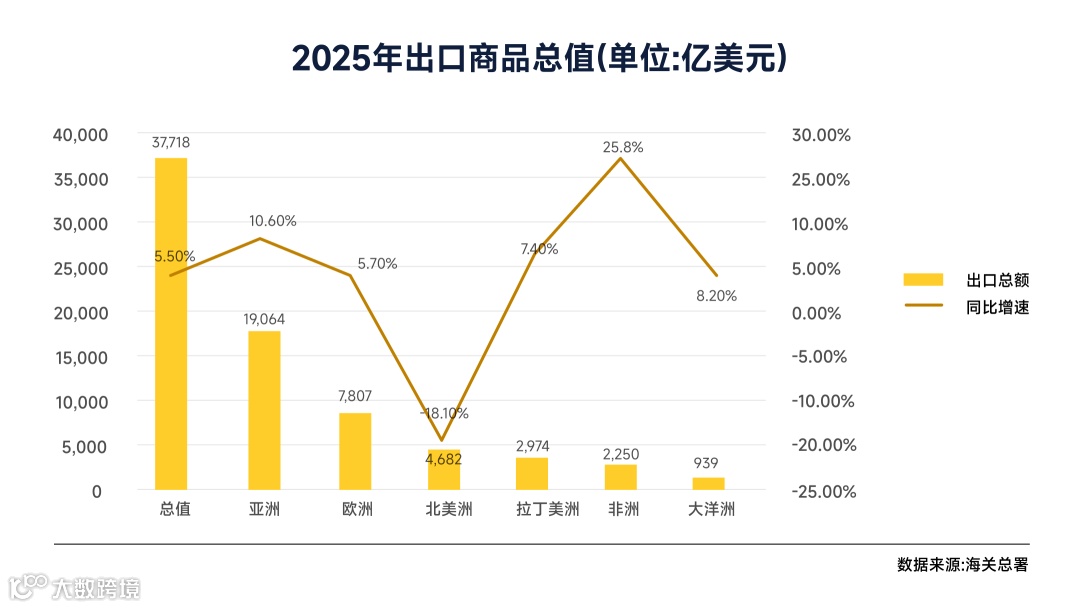 海關(guān)總署數(shù)據(jù)顯示,2025年中國出口總額約3.77萬億美元,同比增長5.5%,實(shí)現(xiàn)貿(mào)易順差1.19萬億美元。
