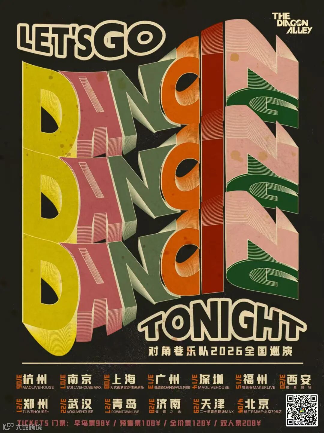 對角巷樂隊2026全國巡演《Let's go dancing tonight》門票現(xiàn)已于秀動,大麥等購票平臺開售!購票可掃描下方二維碼。