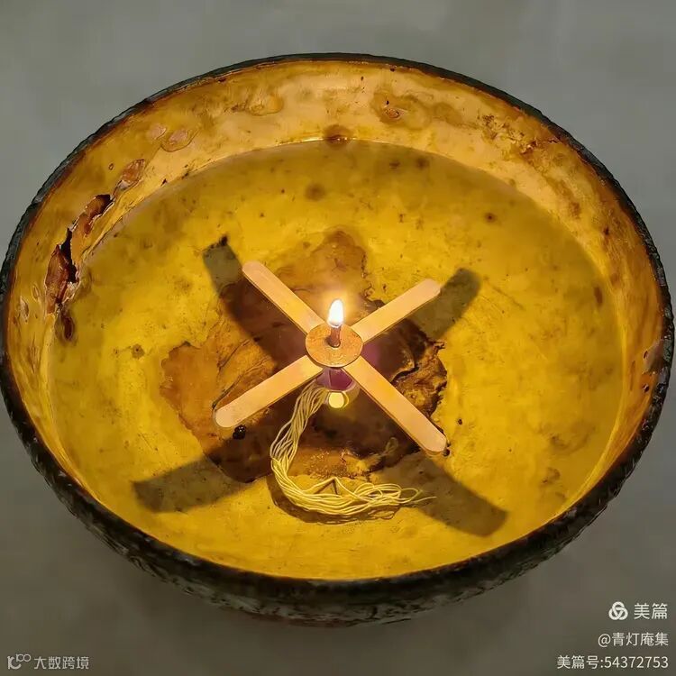 海燈的使用方法之一:用薄木條制作十字架子,中間開孔穿鐵管,漂浮于油之上使用。