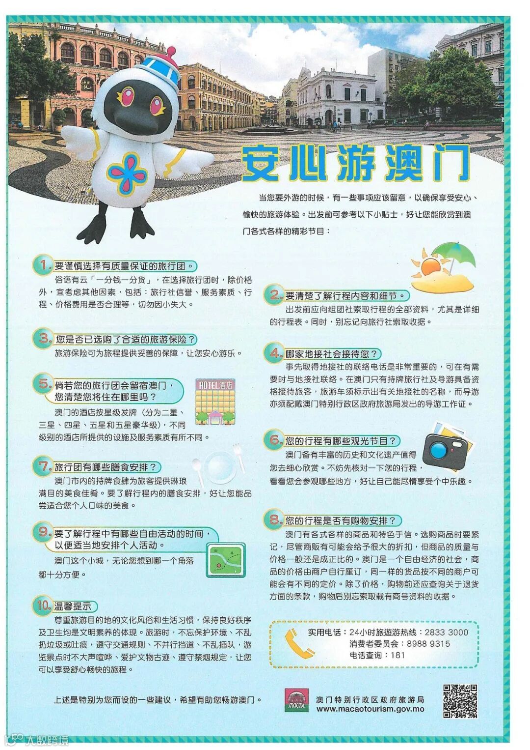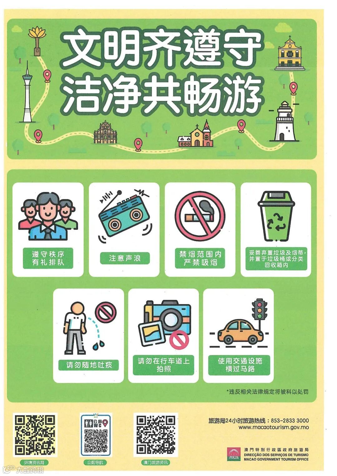 為了讓旅客有安心愉快的旅游體驗(yàn),澳門特別行政區(qū)政府旅游局制作了「安心游澳門」宣傳單及環(huán)境衛(wèi)生宣傳海報(bào),供旅客參閱,詳細(xì)內(nèi)容可掃描以下二維碼查閱: