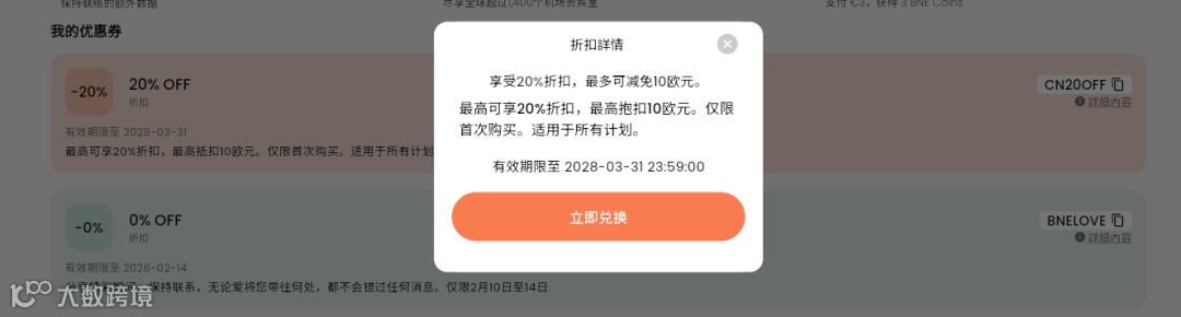 新用戶可使用折扣代碼 CN20OFF,首次購買享受20%優(yōu)惠,最高減免10歐元。