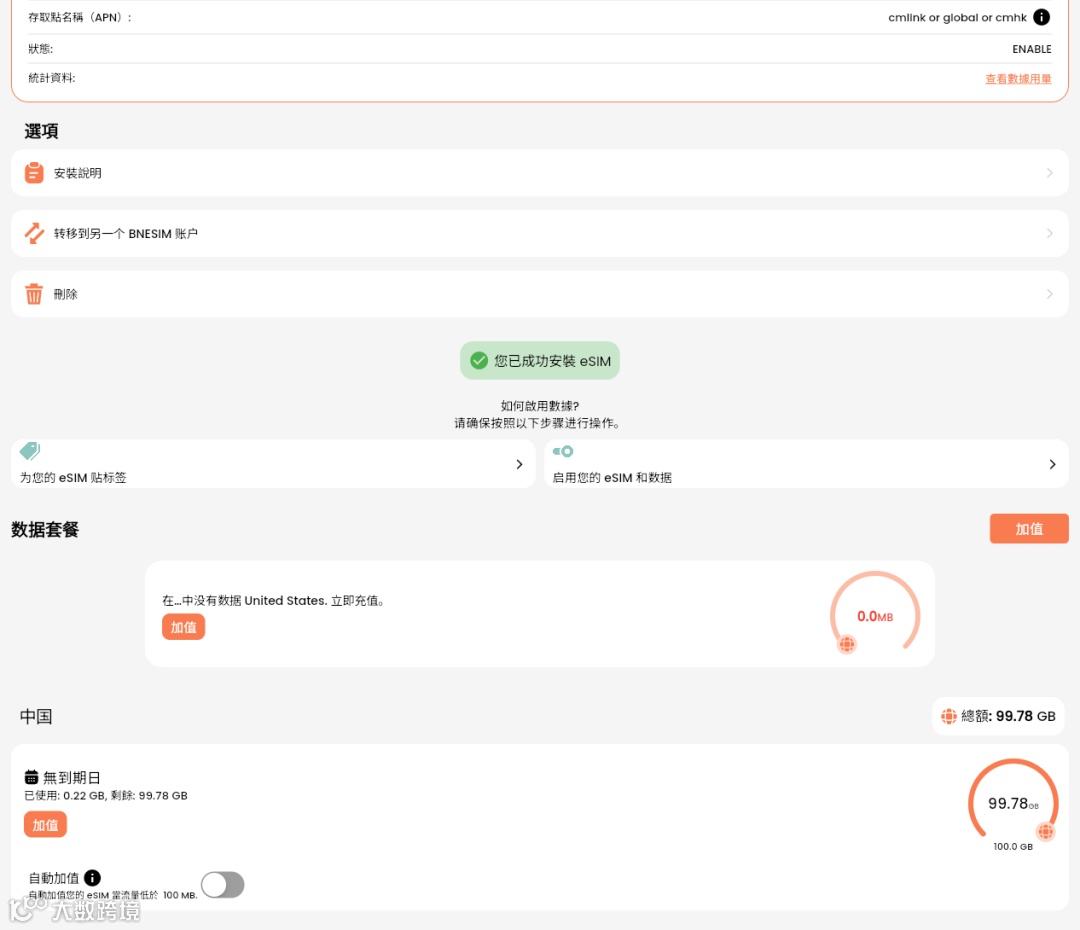 后臺信息顯示該eSim采用CMlink線路,即中國移動國際版網(wǎng)絡(luò),出境漫游時接入中國移動基站,境內(nèi)覆蓋能力強。
