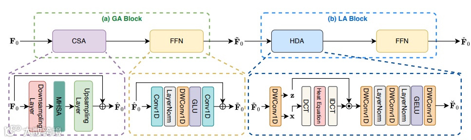 • 局部注意力(LA):創(chuàng)新引入基于熱擴(kuò)散方程的“熱擴(kuò)散注意力”(HDA),利用其平滑特性自適應(yīng)進(jìn)行多尺度濾波,在抑制噪聲的同時(shí)保留語音瞬態(tài)細(xì)節(jié)。